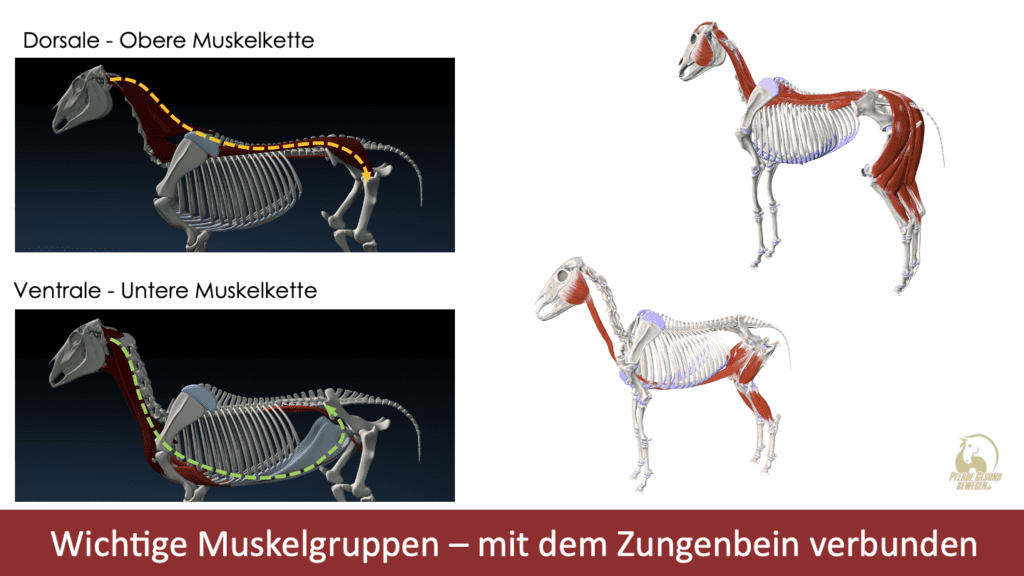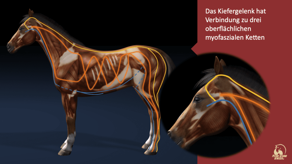 Die Muskeln, die für das Öffnen des Mauls zuständig sind, sind direkt verbunden mit dem Nacken, mit dem Brustbein, und den Schultern. Wir sehen hier eine funktionale “Kette” die sich aus dem Maul über den Rücken bzw. den Bauch bis zur Hinterhand des Pferdes erstreckt.