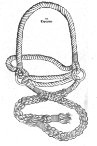 Zur Beizäumung junger Pferde legte Grisone ein sogenanntes Capezona, eine Art Reithalfer, das mit Zügeln verbunden ist und sich bei deren Annahme zusammenzieht.