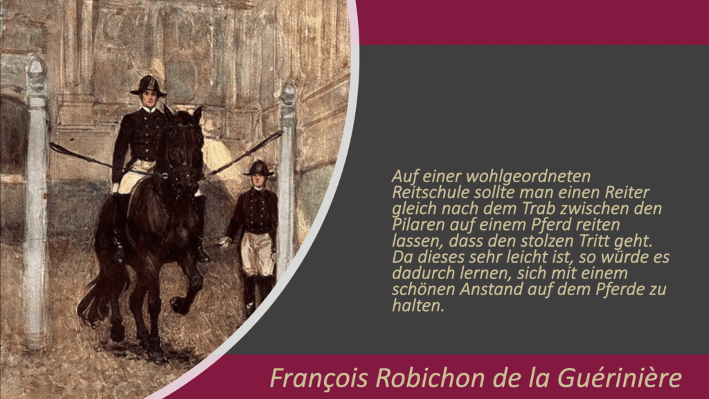 Leider muss man zugeben ist der Ablauf, wie man heutzutage korrektes Reiten lernen soll ein wenig durcheinander geraten. Während die alten Meister den unerfahrenen Reiter auf ein erfahrenes und hochausgebildetes Pferd in der Piaffe gesetzt haben (der Reiter lernte zuerst ein richtiges Gefühl abzuspeichern) – lernt man heute meist auf einem schlecht ausgebildeten Pferd “hoppeln”… (man bekommt also zuerst ein falsches Bild vom Reiten ohne ein richtiges zu kennen und schlimmsten falls sogar ohne gesagt zu bekommen dass das Bild falsch ist). Mal ehrlich – wer hat sich nicht nach seiner ersten “Longensitz-Zentrifuge” gefragt – > Das soll Reiten sein?… das soll Spaß machen? Denn sehr oft geriet die erste Erfahrung im Sattel zu einem sehr anstrengenden Sportereignis, der den Körper des Neu-Reiters vor fast unmögliche Kooperations-Schwierigkeiten stellte, sich mit den Bewegungen des meist schlecht laufenden Pferdes (mit meist festem Rücken) in Einklag zu bringen. Die Vorgehensweise der alten Meister war es also: