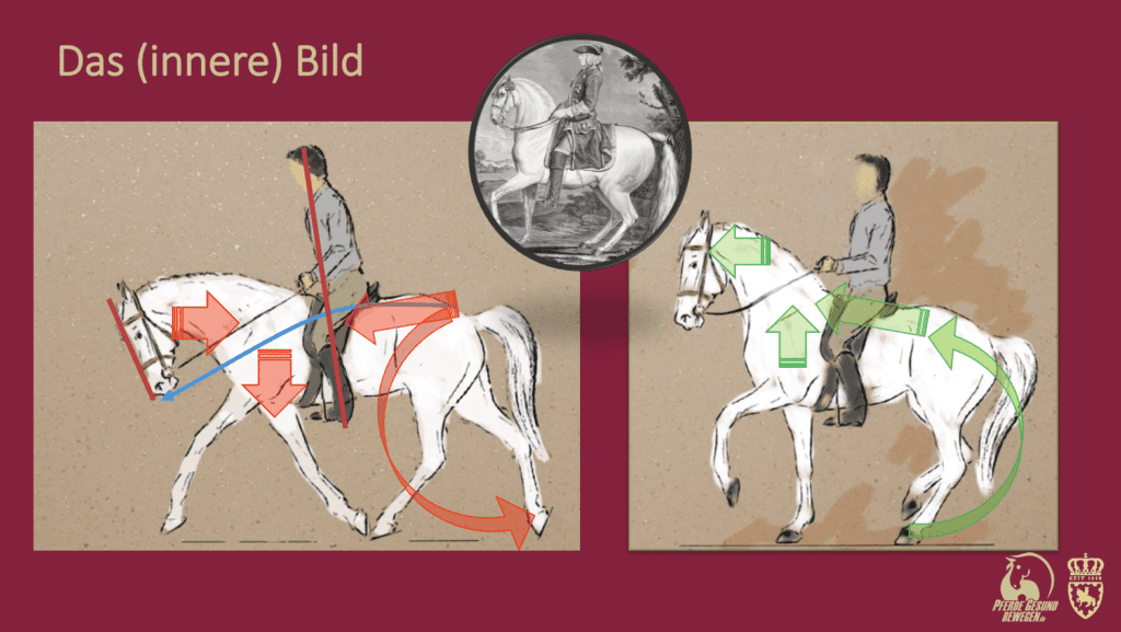 Für mich ist das Erlernen von richtigen Bildern im Kopf und Körper des Reiters die Grundvoraussetzung für korrektes Reiten (lernen) und damit gesundes Bewegen des Pferdes unter dem Sattel. Der Reiter muss in all seinen Körperteilen ein Gedächtnis bilden für richtige Bewegung. Sobald er merkt, dass die Bewegung nicht zu dem im Gedächtnis abgespeicherten Bild passt, besteht Handlungsbedarf.