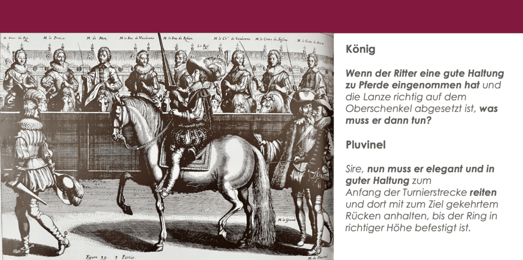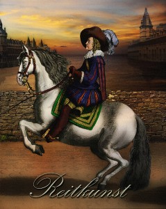 Wer heute am Place des Pyramides in Paris steht sieht das vergoldete Reiterstandbild von Jean d’Arc. Was die meisten Besucher nicht wissen, ist das an dieser Stelle ein wichtiger Vertreter der französischen Reitkunst, nämlich Antoine de Pluvinel im Jahre 1594 die seine Reitschule, die Academie d’Equitation eröffnete. Antoine de la Baume Pluvinel, errichtete eine Institution, in der wie zu dieser Zeit üblich nicht ausschließlich das Fach Reiten auf dem Lehrplan stand. Neben der hohen Kunst der Reiterei wurden die jungen Adeligen darüber hinaus im Tanz und Benehmen unterrichtet. So wurde ihnen zum Beispiel gelehrt wie man sich stilsicher kleidete. Der Unterricht hatte somit einen nicht unerheblichen Einfluss auf die Aristokratie des späten 16ten Jahrhunderts, bis in das 17te Jahrhundert hinein. Einer der berüchtigtsten Schüler dieses Instituts war Cardinal de Richilieu, der vor allem aus den Musketier-Erzählungen von Alexandre Dumas weit über Frankreich hinaus bekannt geworden ist. Ein weiterer Schüler ist der junge William Cavendish, bekannter unter dem Namen Newcastle, welcher selbst in späteren Jahren die Reitwelt mit einem Buch beeinflussen wird. Pluvinel selbst wird aber vor allem durch die Ausbildung des Dauphins des französischen Throns bekannt, dem späteren Ludwig XIII, berühmt. Dessen Reitausbildung ist Thema von Pluvinels Buch „Manège Royal” Die Methode wie Pluvinel Pferde und Reiter ausgebildet wissen will wird in seinem Werk “Manège Royal – L’Instruction du Roy en l’exercice de monter à cheval” in einzigartiger Weise erzählt. Das Werk erscheint 1623 zu einem Zeitpunkt zu dem Pluvinel bereits 3 Jahre verstorben.