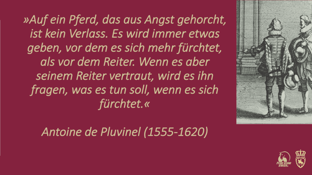 „Das Pferd muss selber Freude an der Reitbahn haben, sonst wird dem Reiter nichts mit Anmut gelingen.” „Wir sollten besorgt sein, das Pferd nicht zu verdrießen und seine natürliche Anmut zu erhalten, sie gleicht dem Blütenduft der Früchte, der niemals wiederkehrt, wenn er einmal verflogen ist.”